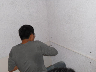 之前訂料數量猶豫再三,就是因為DIY或請木工師父施作舉棋不定.DIY怕手鋸會浪費板料且不漂亮,請木工師父又遲遲等不到其空檔,最後還是下定決心自個兒來,與太太及兒子揮汗做起假日木工.只靠手鋸及電鑽鎖入六角螺釘固定,過程雖產生些許粉末,但比想像還容易且漂亮許多,才花4天工夫,就將練團室DIY改裝完工.鋪上紅地毯擺好練團設備後,看起來還不賴. 可惜的是,天花板部份無法鎖中角材,不得不放棄,板料因此多出10片未使用,改天一定會有用,只希望不會因為反潮膨脹或長出白蟻才好.